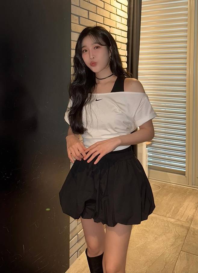 공개한 사진에서 이해리는 블랙 스포츠톱에 화이트 오프숄더 나이키 티셔츠를 레이어드하고 풍성한 실루엣의 블랙 벌룬 스커트를 매치한 애슬레저룩으로 러닝에 나서기 전에 러블리하면서도 트렌디한 스타일을 완성했다.