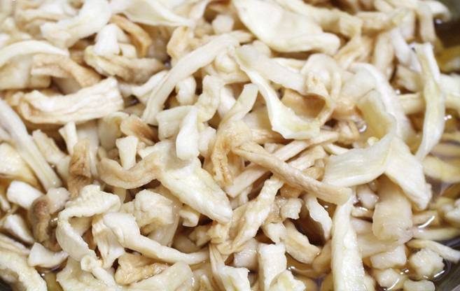 1. 무말랭이를 깨끗하게 씻은 후 약간 미지근한 물을 부어 15분에서 20분 정도 불려줍니다