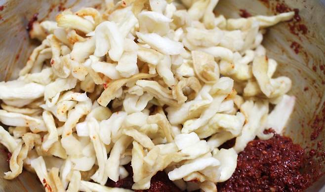 3. 물에 불린 무말랭이를 건져 물기를 꼭 짜서 제거한 뒤 만들어 놓은 양념장에 넣고 버무려줍니다.