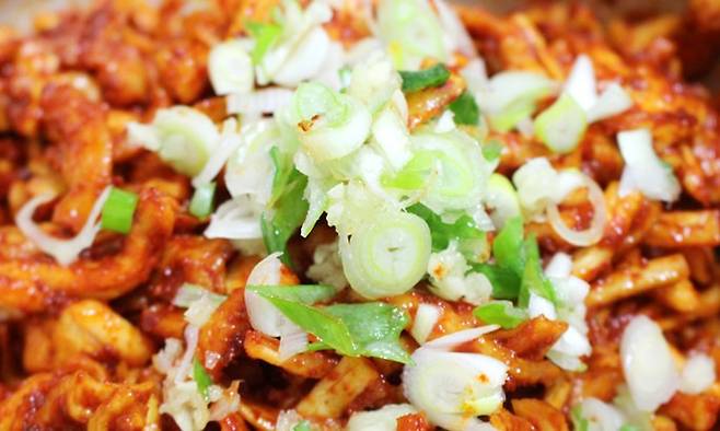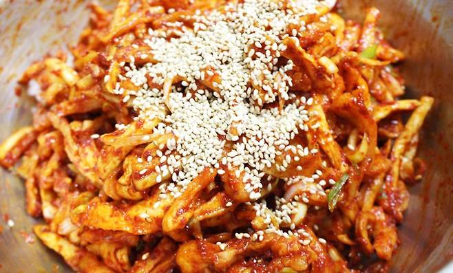 4. 마지막으로 채썬 파와 깨를 넣고 조물조물 무쳐주면 꼬들하고 씹는 맛이 있는 매콤한 무말랭이 완성이에요.