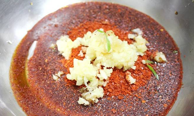 2. 볼에 간장 4스푼, 멸치액젓 2스푼, 올리고당 2스푼, 매실액 1스푼, 고춧가루 5스푼, 다진 마늘 한 스푼을 넣고 잘 섞어주세요.