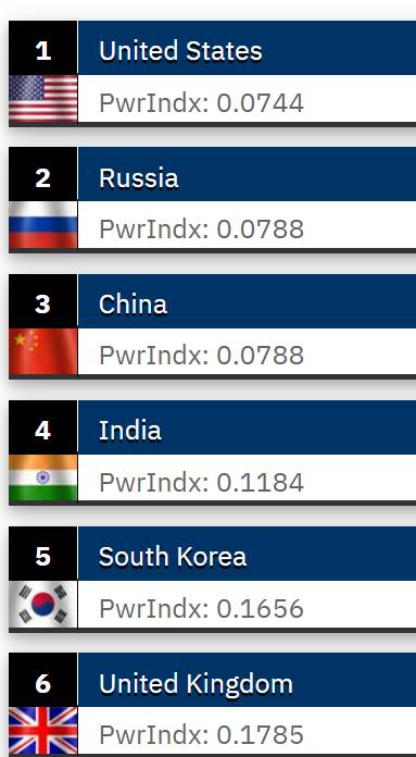 한편 미국은 군사력 평가지수 0.0744로 1위였고 러시아(0.0788), 중국(0.0788), 인도(0.1184)가 그 뒤를 이었다. 한국 다음으로 6~8위는 영국(0.1785), 프랑스(0.1878), 일본(0.1839)이었다.