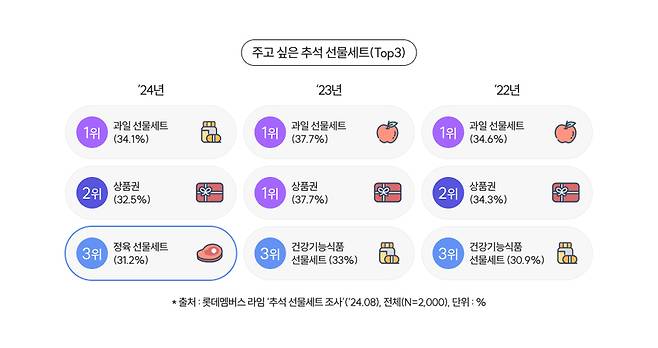 롯데멤버스는 리서치 플랫폼 라임을 통해 지난 달 16∼20일 전국 성인 남녀 2천명을 대상으로 추석 선물 계획을 설문 조사한 결과 이같이 나타났다고 오늘(10일) 밝혔습니다.
