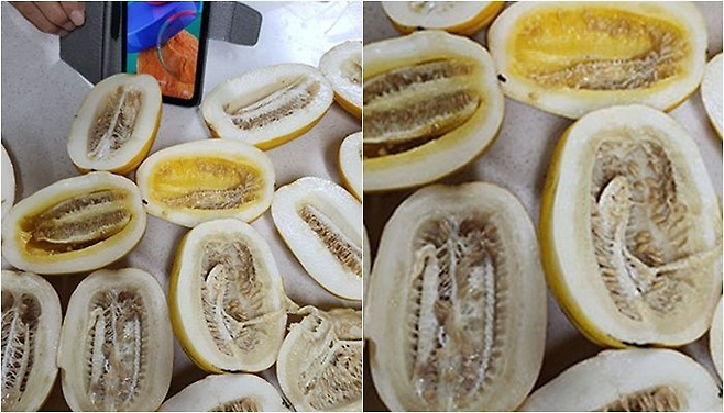 A씨가 올린 사진에는 반으로 자른 참외 6~7개가 전부 상한 상태였다. 참외 속 씨앗까지 누렇게 변한 모습이었다. A씨는 사진을 촬영한 날짜와 시간이 표시된 휴대전화 화면도 함께 올리며 조작이 아님을 증명했다.