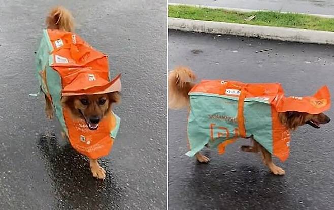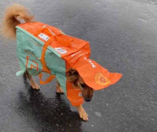 당사자인 강아지 비비는 집사가 만들어서 입혀준 마트 장바구니 비옷이 마음에 쏙 들었는지 유유히 길거리를 활보하며 멋짐을 제대로 발산했는데요.