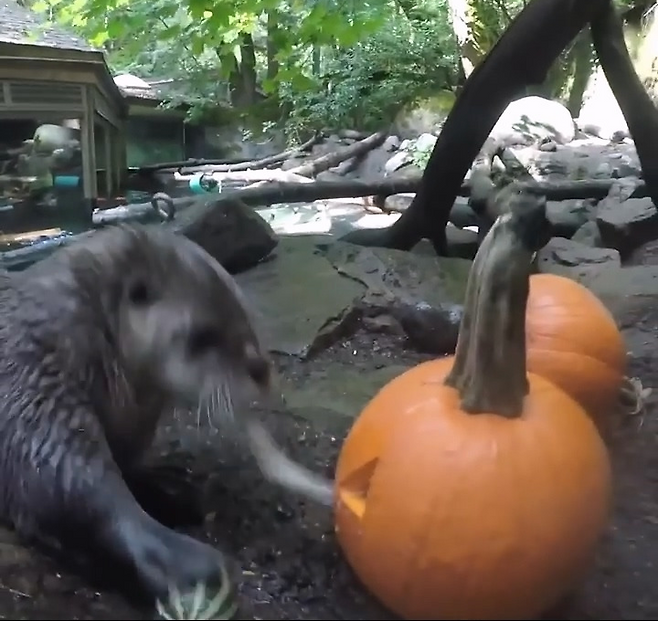 수달들은 무서운 표정을 하고 있는 이 호박이 전혀 겁나지 않고 재미있어 보이기만 하나 봅니다.