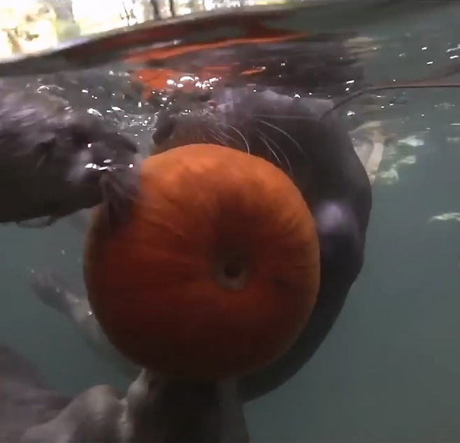 사육사들이 수달들에게 하여금 이 호박에 관심을 가질 수 있도록 미리 안쪽에 맛있는 물고기들을 넣어 둔 것이었네요.