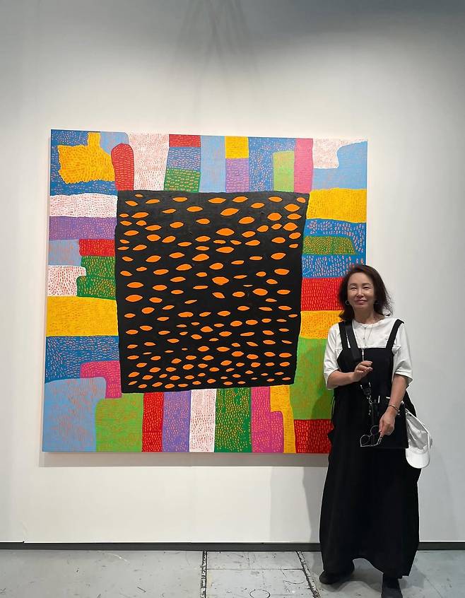 사진 속 김미숙의 패션은 가장 완벽한 '갤러리룩'의 정석이었습니다. 알록달록한 예술 작품들을 존중하듯,