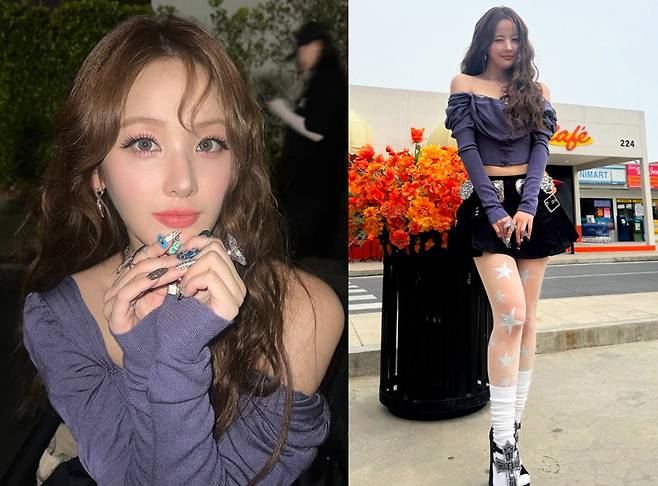 벨은 어깨 라인이 드러나는 보랏빛 크롭 오프숄더 니트 톱에 실버 벨트 장식이 더해진 블랙 미니 스커트를 매치해 걸리시하면서도 도발적인 무드를 완성했습니다.