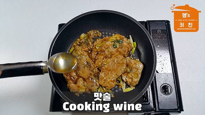맛술 1큰술을 돼지고기 위에 부어주고 열심히 구워줍니다