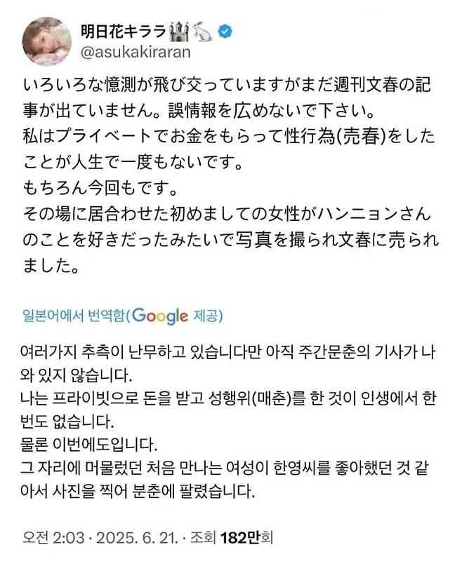 한편, 아스카 키라라 씨는 자신의 SNS를 통해 “태어나서 단 한 번도 돈을 받고 성매매를 한 적이 없다”고 주장하며 주학년 씨를 옹호했습니다. 그러나 파파라치 사진이 공개된 후, 키라라 씨의 해명은 오히려 논란을 더욱 증폭시키는 결과를 낳았습니다.