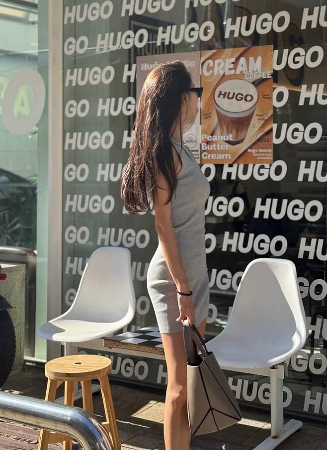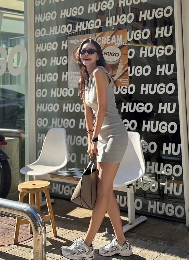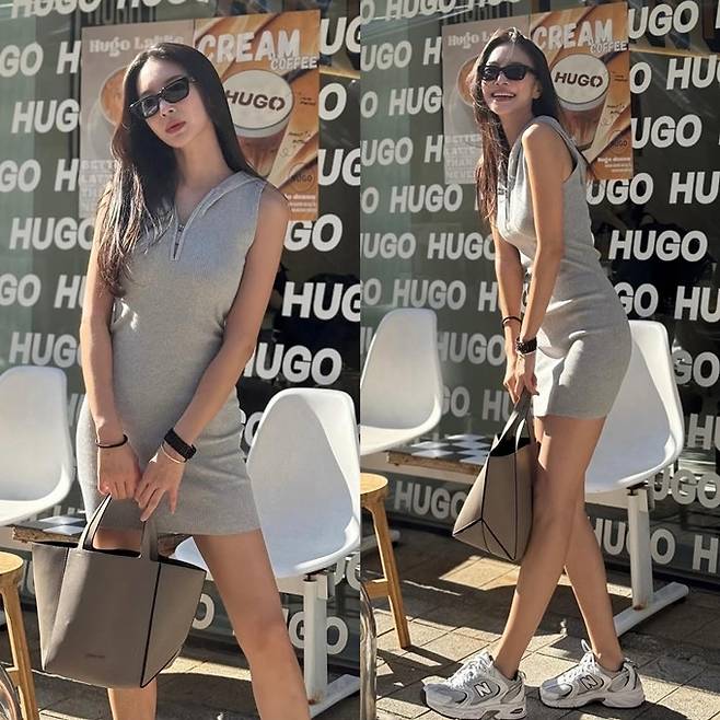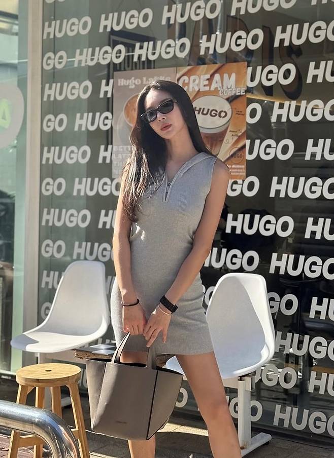 공개한 사진에서 김윤지는 지퍼 디테일이 가미된 슬림한 핏의 그레이 민소매 니트 원피스룩으로 군살 하나 없는 탄탄한 몸매를 과시했다.