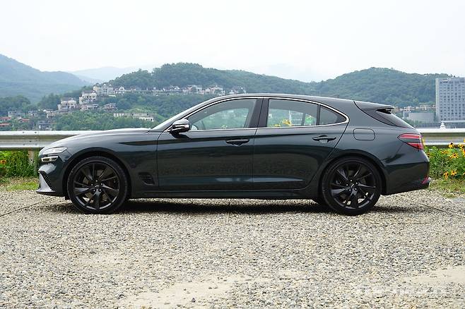 G70 슈팅브레이크의 외관 디자인은 쿠페형 스타일로 꽤나 날렵한 분위기다. G70 세단에 트렁크만 늘린 것처럼 보이지만, 1열 도어부터 리어까지 패널은 모두 새로운 디자인이다. 전장 4685mm, 전폭 1850mm, 전고 1400mm, 휠베이스 2835mm의 크기는 세단과 동일하다.
