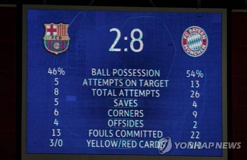 토마스 뮐러와 필리페 쿠티뉴가 각각 2골씩 터뜨리고 이반 페리시치, 세르주 그나브리, 요주아 키미히, 로베르트 레반도프스키가 골맛을 보면서 알라바의 자책골과 루이스 수아레스의 만회골에 그친 바르셀로나를 크게 이겼다. 챔피언스리그 토너먼트에서 단일 경기 최초 8득점 경기로 기록된 경기였다.