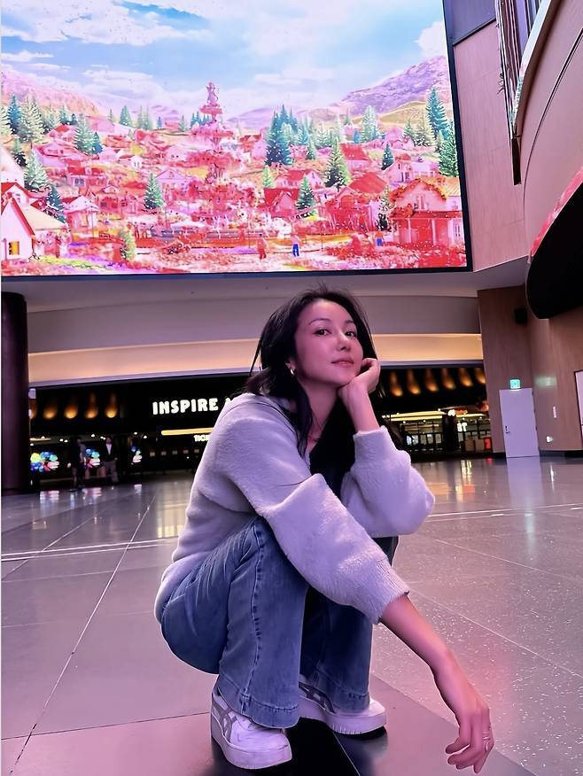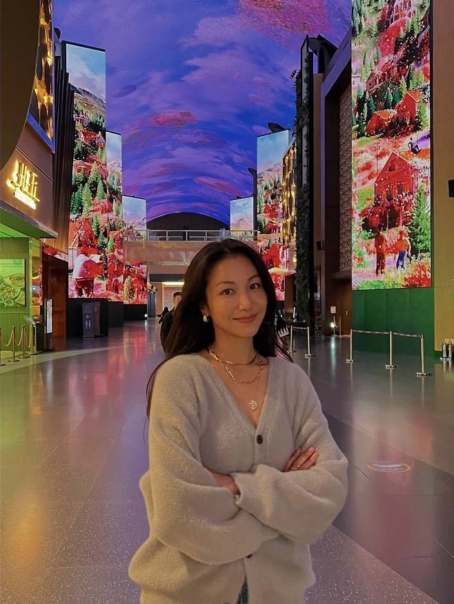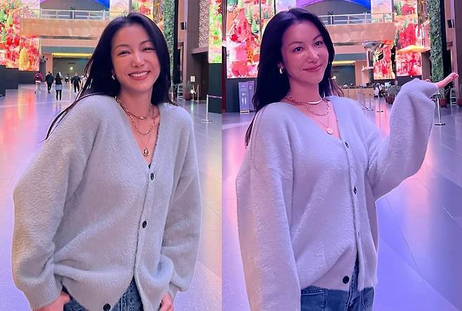 화려한 디지털 천장이 펼쳐진 실내 광장에서 포즈를 취한 김옥빈은 루즈한 연그레이 니트 카디건에 워싱 데님을 매치한 심플한 데일리룩으로 청순함과 시크함을 동시에 드러냈습니다.
