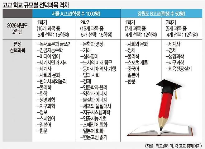 고교 규모에 따른 수업 선택권 격차는 전국적 현상이다. 교육부가 지난해 9월 발표한 ‘고교학점제 운영 개선 대책’에서 고교 1100곳의 수업 편성 상황을 조사한 내용에서 드러난다. 현 고2가 12개 학급 이하 소규모 학교를 다닐 경우 고교 3년 동안 평균 84.5개 과목을 접할 수 있다. 13~24개 학급 규모의 중간 규모는 97.2개, 25학급 이상에선 99.3개다. 학교가 농산어촌(군 지역)에 있으면 85.9개, 도시(시·구 지역)에 위치하면 98.6개다.