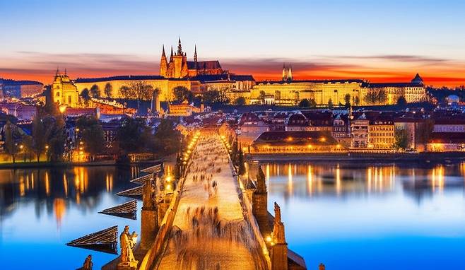 • 오후: 화약탑을 지나 카를교로 향합니다. 카를교는 블타바 강을 가로지르는 아름다운 다리로, 다리 위에는 성인 조각상들이 늘어서 있습니다. 카를교를 건너 프라하 성 지구로 이동합니다.
