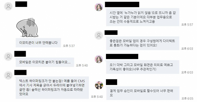그중 구성원들이 가장 낮은 점수를 준 요소는 바로 이모티콘 응답 기능의 부재와 부담스러운 스티커였다. 이모티콘 응답은 특정 채팅에 대해 참여자가 작은 스티커를 붙여 공감, 확인 등의 의사표시가 가능한 기능이다. 불필요한 채팅이나 알림을 울리지 않게 하면서도 의사 표현이 가능하기 때문에 슬랙 시절 구성원들 사이에서 널리 쓰였다. 카카오톡도 올해 이와 같은 기능을 도입한 바 있다.