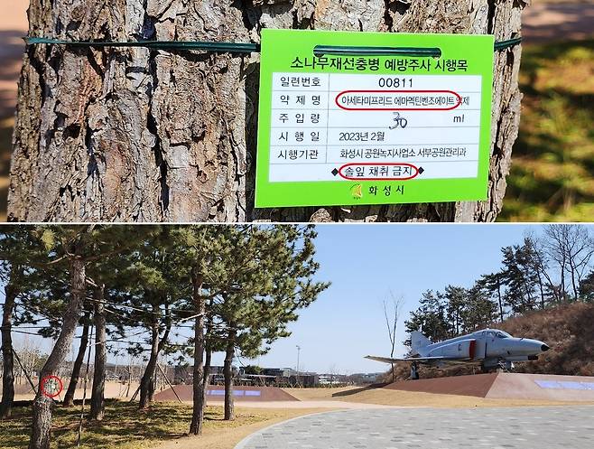 '소나무재선충병 방제 실시구역'이라는 현수막에 '나뭇잎, 열매, 나물 등 일체 채취 금지'한다고 적어 놓았다. 소나무에 주입한 재선충 예방 농약이 인체에 유해하다는 것을 산림청과 지자체 공무원들이 잘 알고 있다는 뜻이다.