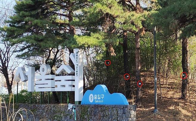 | ▲ 서울숲 역시 소나무마다 소나무재선충병을 예방한다며 농약을 주입했다. |