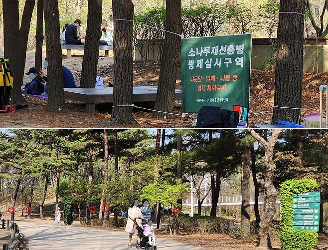| ▲ 서울숲 소나무마다 농약을 주입했고, 잎사귀와 나물을 따지 말라는 현수막이 붙어 있다. |