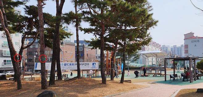 | ▲ 수원시의 한 마을 놀이터 옆 소나무에도 농약을 주입했다. 어린아이들과 주민 건강엔 아무 영향 없을까? |
