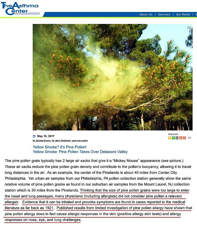 해외 의학계도 대한민국 산림청처럼 송홧가루 크기가 커서 폐로 흡입되지 않아 안전하다고 할까? 아니다. 송홧가루가 폐로 흡입되어 건강에 위협이 된다는 많은 의학자의 연구 결과가 있다.