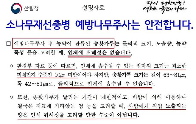 산림청은 소나무 살충제가 잔류하는 송홧가루가 영유아와 임산부에게 미치는 영향에 대해 단 한 번도 검증해 본 적이 없다. 그저 환경부의 미세먼지 자료에 의해 송홧가루 크기가 커서 흡입되지 않기 때문에 인체에 안전하다는 주장뿐이다.