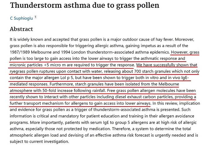 커다란 꽃가루가 디젤 차량의 배기 오염물질과 결합하여 폐로 흡입된다는 또 다른 보고서들도 찾아냈다. C 수피오글루가 쓴 '잔디 꽃가루로 인한 천식'(1999년)에 따르면, '크기가 큰 꽃가루가 흡입되어 천식 반응을 일으키기 위해서는 5㎛ 이하여야 하는데 꽃가루가 물과 접촉하면 파열되며, 특히 꽃가루의 알레르겐 분자는 대기 중 디젤 차량의 오염물질과 상호 작용하여 폐로 흡입되는 수송 메커니즘을 제공한다'고 나온다.