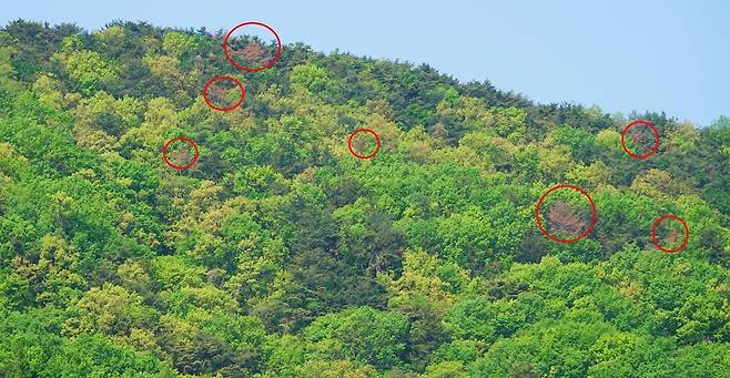 | ▲ 부산에서 밀양으로 가는 도로변에 소나무재선충으로 죽어가는 소나무들을 곳곳에서 불 수 있다. |
