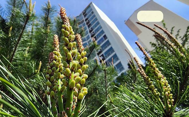 | ▲ 아파트 중앙에 키 큰 소나무가 노란 송홧가루를 사방으로 날리고 있다. |