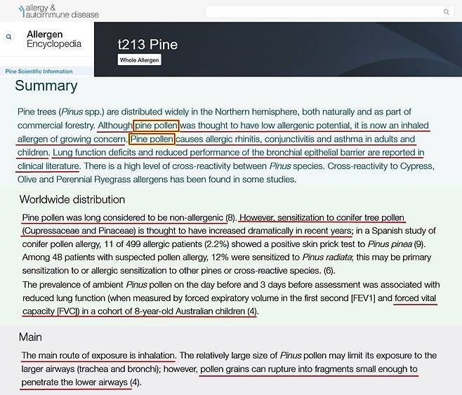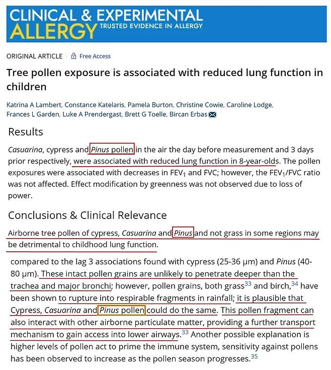 알레르기 백과사전 보고서의 신뢰성을 확인하기 위해 참고문헌을 확인하며 계속 추적해 보았다. 카트리나 램버트와 여러 학자들이 방대한 조사를 통해 작성한 '나무 꽃가루 노출은 어린이의 폐 기능 감소와 관련이 있다'(2020)는 보고서는 소나무 꽃가루가 어린이의 폐 기능에 해롭다고 지적한다. 특히 어린아이들은 신체활동의 차이에 따라 입으로도 숨을 쉬기 때문에 꽃가루 입자가 비강의 여러 경로를 우회한다며 코를 통한 흡입이 전부가 아님을 지적하였다.