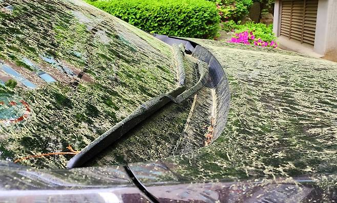 | ▲ 아파트 주차장에서 노란 송홧가루를 뒤집어 쓴 자동차 |