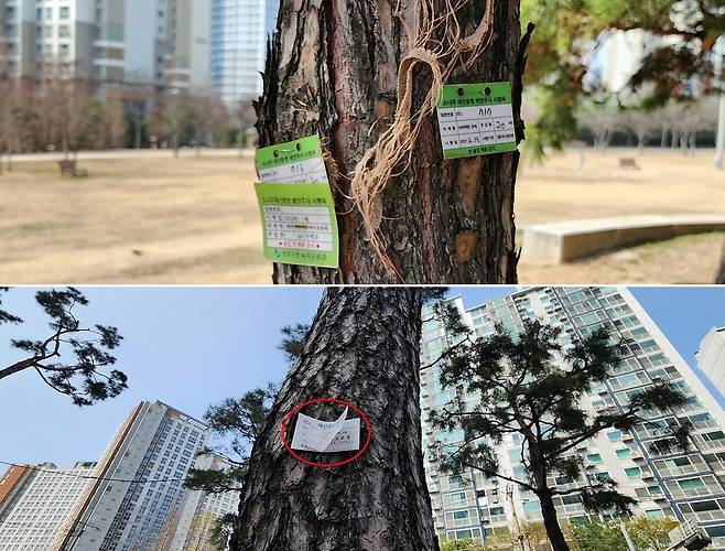 | ▲ 농약 주사 명찰을 달고 있는 소나무. 위의 나무는 3장, 아래는 2장이다. 수원시에 소나무재선충이 유입되지 않았음에도 소나무마다 농약을 주입하는 재난의 도시가 되었다. |