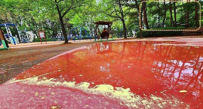 | ▲ 농약을 주입한 송홧가루가 아파트 정원과 어린이 놀이터를 덮고 있다. |