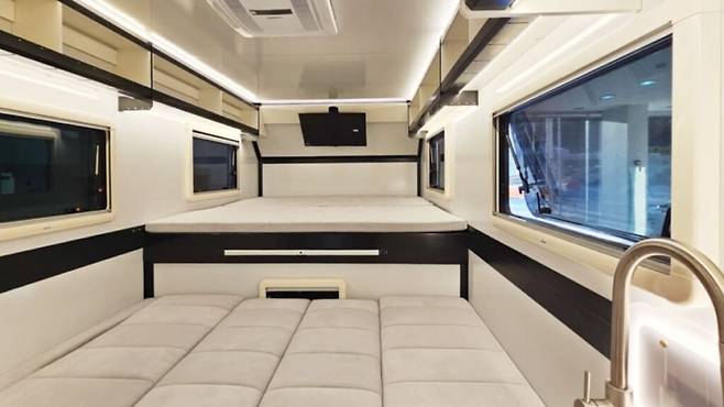 실내는 타스만 기반 아틀라스타6와 동일한 디자인과 사양이 적용되며, 소비자의 요구에 따라 변경이 가능합니다. 2m x 2m 크기의 벙크베드는 4인 가족이 충분히 앉아서 생활하고 잘 수 있는 공간을 제공합니다.