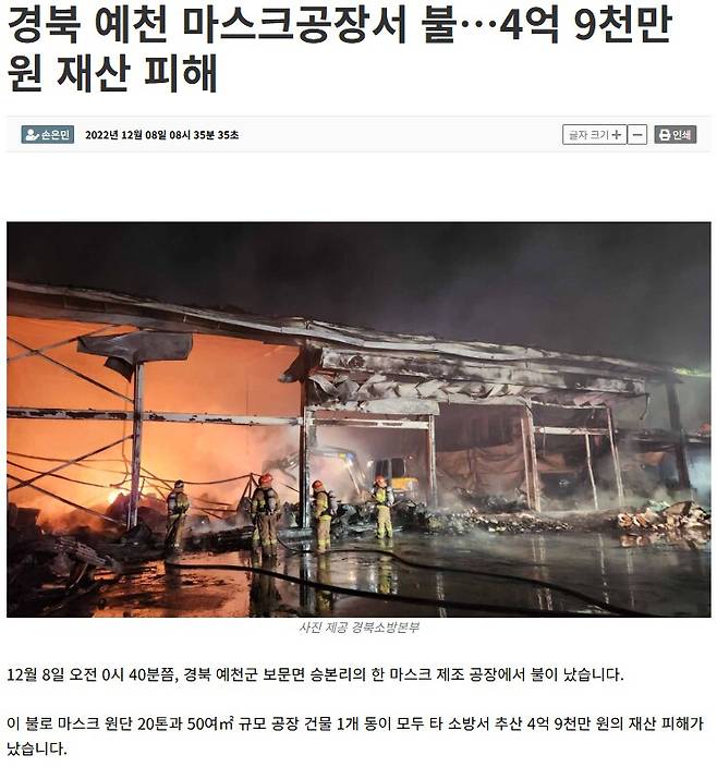 2022년 12월 8일, 경북 예천군의 한 마스크 공장에서 화재가 나