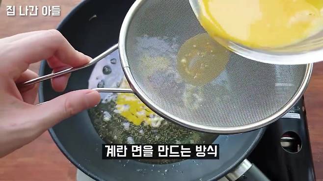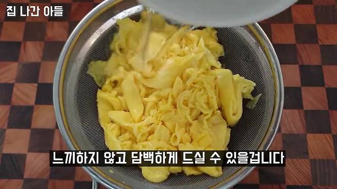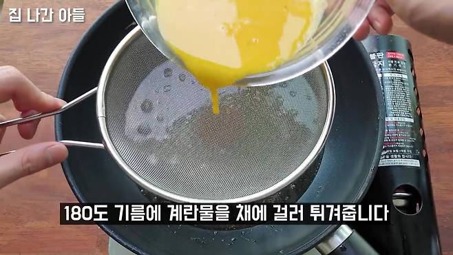 180℃ 기름에 체로 계란물 걸러 넣기 체에 부어내리듯 튀기면 계란면 완성