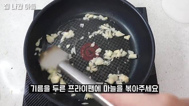 마늘 볶아 바지락육수 만들기 다진 마늘 5쪽 → 기름에 볶기