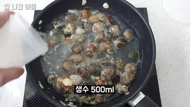 바지락 넣고 생수 500ml 붓기