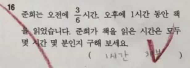 초등학교 3학년 학생이 ‘오전에 3/6시간’이라는 조건을 ‘0.5시간’으로 해석해 ‘1시간 30분’이라는 답을 써냈다가 시험 오답 처리를 받았다는 사연입니다
