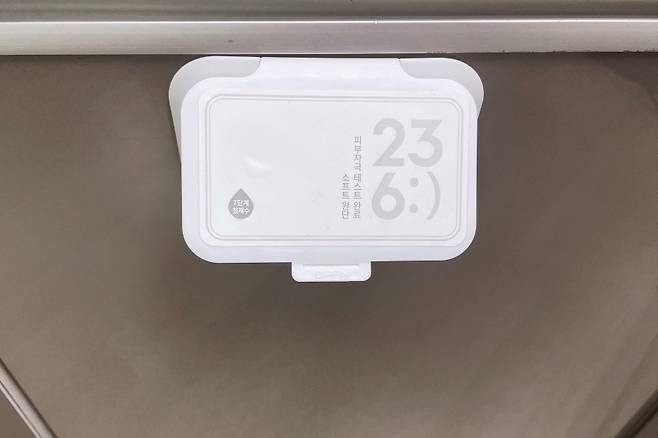 이럴 때 물티슈 뚜껑을 싱크대에 붙여보세요. 물티슈 뚜껑 접착이 남아있다면 바로 붙여도 되고요. 접착력이 떨어진다면 양면테이프를 붙인 다음 붙여주세요.