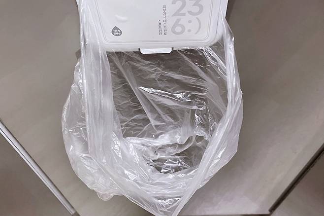 그다음 물티슈 뚜껑에 비닐봉지를 끼워주면 되는데요. 이렇게 해주면 주방 자질구레한 쓰레기 수거함으로 변신한답니다.