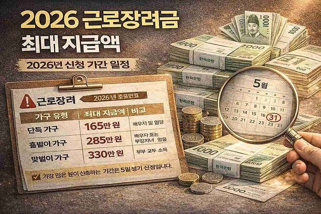 물가 상승 등을 반영해 근로장려금 지급액은 매년 조정된다.2026년 기준 가구별 최대 지급액은 다음과 같다.