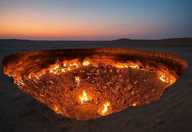 당시 학자들은 천연가스가 지상에 확산되지 않도록 구멍에 불을 붙였다. 천연가스가 불타며 시뻘건 불기둥을 내뿜는 이곳을 현지인들은 언제부턴가 ‘지옥으로 가는 문’이라고 불렀다.