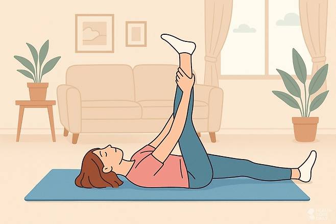 피로가 많이 쌓인 날에는 누워서 스트레칭을 하는 것도 좋다. 바닥에 등을 대고 누운 뒤 한쪽 다리를 천장 방향으로 뻗는다. 양손으로 발목을 잡아 천천히 가슴 쪽으로 당기며 허벅지 뒤와 종아리에 자극을 준다. 무릎을 곧게 펴고 발끝을 무릎 쪽으로 당기면 스트레칭 효과가 더해진다. 이 자세를 약 20초간 유지하고, 반대쪽 다리도 같은 방법으로 반복한다.
