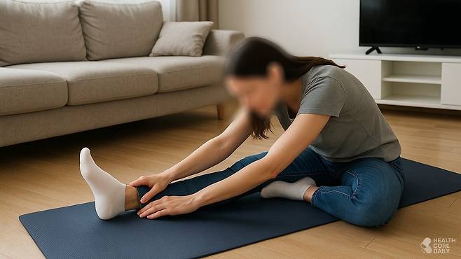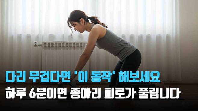 하루 종일 서 있거나 오래 앉아 있는 사람이라면 앉은 자세로 종아리 스트레칭을 하면 도움이 된다. 매트 위에 앉아 한쪽 다리를 길게 뻗고, 반대쪽 다리는 무릎을 접어 펴놓은 다리 위에 올린다. 숨을 가볍게 들이마신 뒤, 내쉬는 숨과 함께 상체를 천천히 앞으로 숙인다.