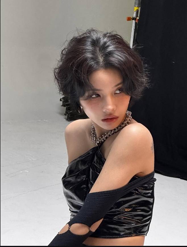 여기에 짧은 숏컷 스타일링에 과감한 메이크업을 더해 강렬한 인상을 남겼으며, 오프숄더 디자인의 블랙 레더 탑에 크리스털 초커를 매치해 고급스러운 반항미를 완성했습니다.