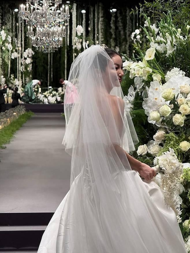 길게 늘어뜨린 면사포 아래 드러난 그녀의 옆모습은 우아함 그 자체로, 보는 이들의 깊은 감탄을 자아내기에 부족함이 없어 보입니다.