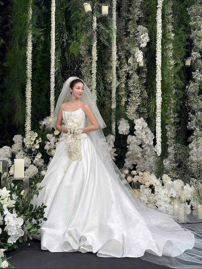 군더더기 없이 떨어지는 실크 드레스와 풍성한 화이트 부케의 조화는 그녀가 가진 고유의 클래식한 아름다움을 더욱 돋보이게 만듭니다.